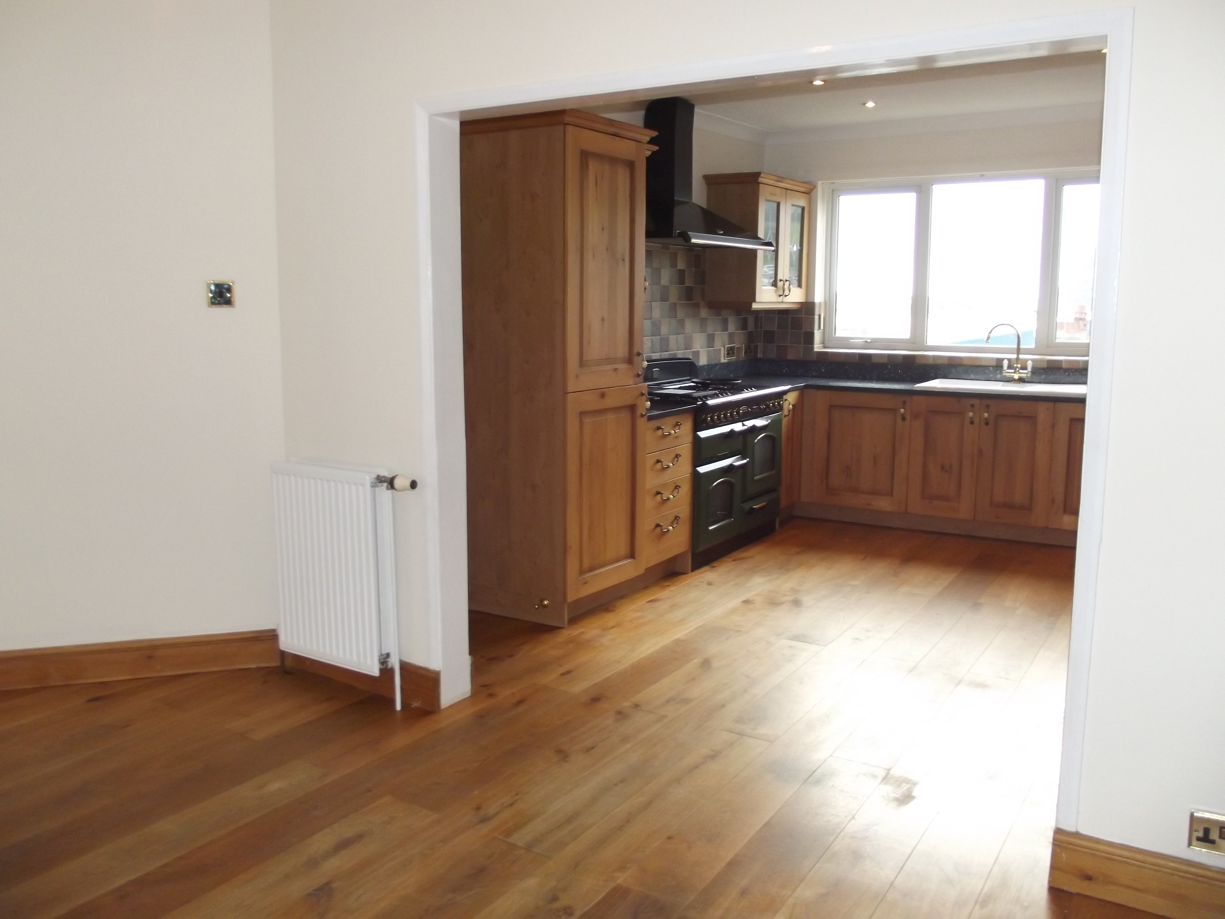 The lounge and kitchen are open plan and the solid oak flooring runs through. There is a bay window helping to give lots of light to the the room